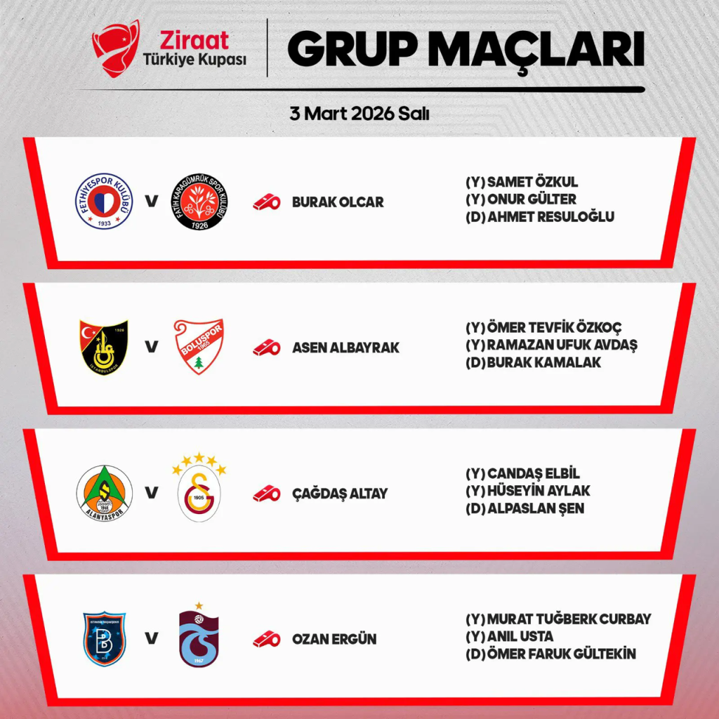 Türkiye Futbol Federasyonu Merkez Hakem Kurulu, Ziraat Türkiye Kupası 2025/26 sezonu grup etabında 3 Mart Salı günü oynanacak dört karşılaşmanın düdük çalacak hakemlerini açıkladı.