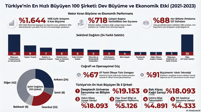 Kaynaklarda yer alan TOBB ve TEPAV’ın hazırladığı “Türkiye 100” listesine göre, Türkiye’nin en hızlı büyüyen şirketleri 2021-2023 döneminde ortalama %1.644 büyüme kaydederek nominal milli gelir artışının tam 6 katı bir performans sergiledi . Zirvenin sahibi, cirosunu inanılmaz bir şekilde %19.153 oranında artıran Ankara merkezli Deeptech Universe olurken; onu Batı Kipaş Kağıt (%18.093) ve Figo Ticari Bilgi (%5.126) izledi. Sadece büyümekle kalmayan bu şampiyon şirketler, aynı zamanda toplam istihdamlarını da %88 oranında artırarak ekonomiye devasa bir katkı sağladı.
